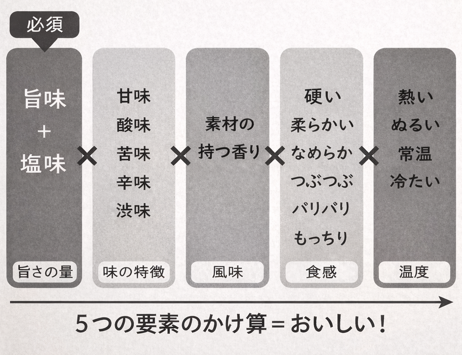 方程式は、「旨さの量」×「味の特徴」×「風味」×「食感」×「温度」という要素の掛け算で決まる。