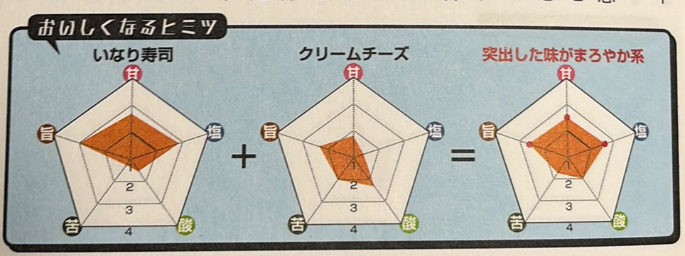 いなり寿司は、旨味、甘味、塩味、酸味のすべての味覚が存在感がある数値で存在し、コクもある。